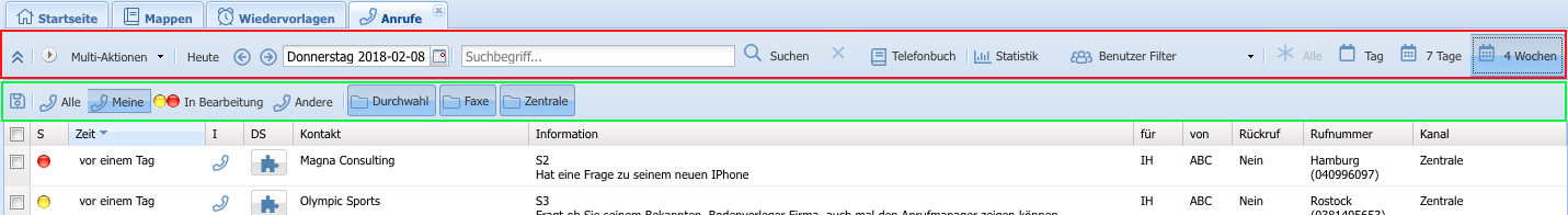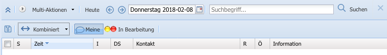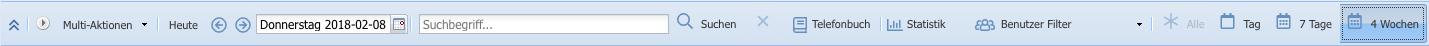 Steht der Schalter auf Tag und Sie klicken die Pfeile vor dem Datum, wandert das Datum tagweise vor und zurück. Steht der Zeitraum auf 7 Tage oder 4 Wochen, wandert das Referenzdatum dynamisch mit dem ausgewählten Referenzdatum. Die Eingrenzung der Ansicht anhand von Datum und Zeiträumen ist notwendig, damit die Liste der Anrufe und Dokumente nicht zu lang werden und Sie von optimalen Ladezeiten profitieren. Aus diesem Grund wurde bewusst bei verschiedenen Aktivitäten auf den Button Alle verzichtet.