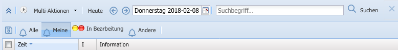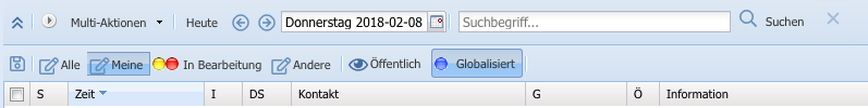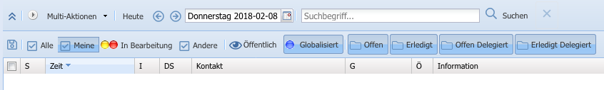 Ist der Schalter Alle aktiviert, werden Ihnen alle Anrufe, E-Mails usw. angezeigt, die Sie sehen dürfen, bezogen auf das Datum und den Zeitraum der in der Funktionsleiste gesetzt ist. Zu Alle gehören also z. B. Dokumente, die Sie in Ihren Ablagen haben, die an Sie delegiert oder veröffentlicht wurden. Beim Klick auf den Schalter Alle, wird rechts davon alles aktiviert, was dazu gehört. So sehen Sie direkt, was Alle bedeutet.