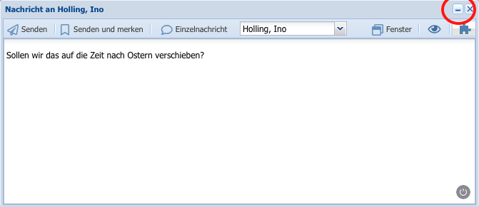 Nachrichten die Sie bekommen, oder schreiben, lassen sich durch das bekannte Icon rechts oben in die Taskleiste der infra-struktur legen, um erst an anderen Dingen weiter zu arbeiten. Bei eingehenden Nachrichten, wird das Aufpoppen weiterer Nachrichten unterdrückt, bis diese Nachricht gelesen oder gemerkt wurde.