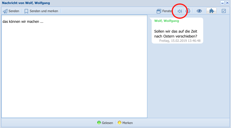 Die unteren Button Senden und Senden und merken verschicken die Nachricht, beim Merken bleibt die Nachricht für den Versender gelb auf der Startseite, um sie im Auge zu behalten