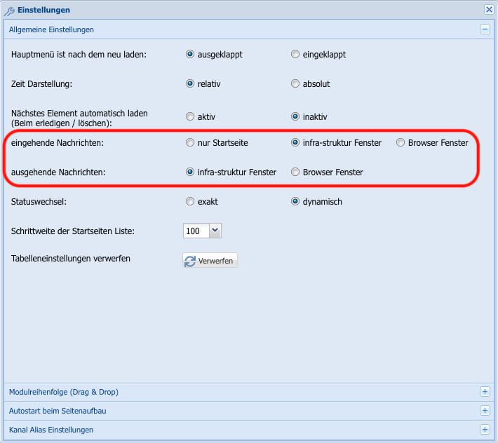 Hier haben Sie die Möglichkeit festzulegen, ob die Nachrichten in einem echten Browser Fenster erscheinen sollen (Nachteil: langsamer, Vorteil: lässt sich über andere Programme legen), das interne infra-struktur Fenster (Vorteil: schnell, Nachteil: nur innerhalb der infra-struktur verschiebbar) oder "nur Startseite". Die letzte Option erzeugt gar kein Fenster beim Anwender, neue Nachrichten erscheinen mit rotem Punkt als neue Zeile auf der Startseite und man wird weniger gestört.