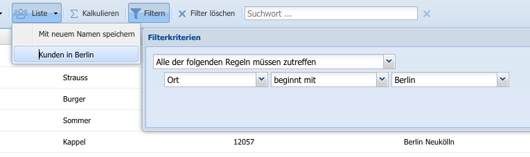 Diese gespeicherten Datensatz Listen finden Sie ebenfalls im Organisationsmenü und können in der Tabellenansicht mit dem Punkt Liste geladen werden.