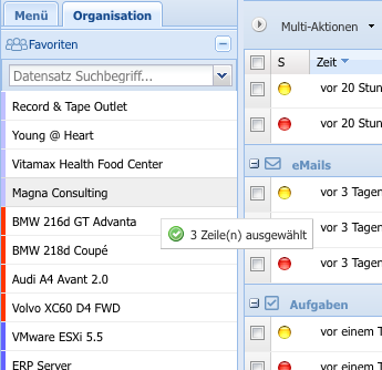 Möchten Sie z. B. mehrere E-Mails oder Anrufe von Ihrer Startseite mit einem Datensatz Ihrer Favoritenliste verknüpfen, wählen Sie die entsprechenden E-Mails oder Anrufe per Checkbox aus, ziehen Sie auf den Datensatz in Ihrer Favoritenliste und lassen Sie dort einfach fallen. Durch die neue Verknüpfung verändert sich nach wenigen Sekunden natürlich auch der Puzzle-Button der jeweils ausgewählten E-Mails oder Anrufe. Denn es ist ja eine neue Datensatzverknüpfung hinzugekommen.