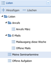 Die Schaltflächen Hinzufügen und Löschen bieten Ihnen die Möglichkeit, Ordner zu erstellen oder zu löschen. So bringen Sie Struktur in Ihre Listen. Das Löschen einer Liste löscht keine Aktivitäten, sondern nur die Abfrage auf ein Modul. Eine gelöschte Liste kann also jederzeit wieder neu erstellt werden.