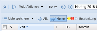 Sie können in den einzelnen Modulen eine tabellarische Darstellung von z. B. Anrufen erzeugen. Diese Tabellenansicht können Sie modifizieren, in dem Sie die Buttons Meine, Andere oder Alle setzen. Darüber hinaus können Sie den Benutzerfilter anwenden oder andere Zeiträume definieren. Auch die Suche kann mit einbezogen werden. Haben Sie sich z. B. mit Hilfe der o. g. Buttons eine Wunschansicht konfiguriert, können Sie diese per Button Liste speichern fest hinterlegen. Somit brauchen Sie die Schalter und Filter nicht jedes Mal bei Öffnen des Moduls neu zu setzen. Neben der Möglichkeit, einen Standard für eine Liste von Aktivitäten zu speichern, können Sie zusätzlich, beliebige weitere Schalterkonstellation als Liste abspeichern.