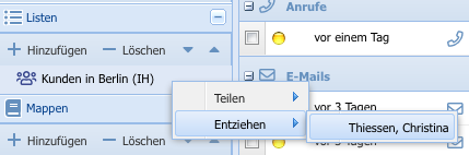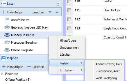 Dazu klicken Sie im Organisationsmenü mit der rechten Maustaste auf die Liste und finden dort die Punkte Teilen und Entziehen. In der dortigen Auswahl finden Sie die Benutzer und virtuellen Gruppen, denen Sie eine Liste teilen können. Wenn Sie einen Liste geteilt haben, oder Ihnen eine Liste geteilt wurde, wird zur Unterscheidung auch das Symbol der Listen fetter dargestellt.