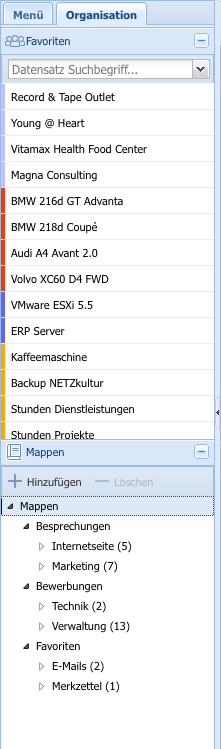 Dieses neue Menü basiert auf der Idee, Elemente von der Startseite per Drag & Drop auf Datensätze oder in Mappen strukturiert abzulegen.