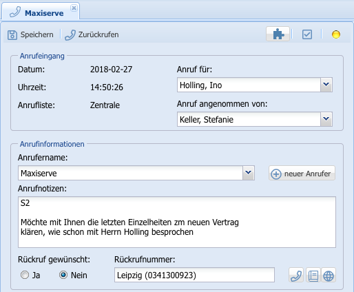Anrufername hinzufügen (Beispiel): Sie erhalten einen Anruf der Firma "Maxiservve". Die Rufnummer ist in der digitalen Kundenakte der Firma Maxiserve in Ihrer infra-struktur hinterlegt, die Rufnummer daher bekannt. Der Anrufname "Maxiserve" wird in diesem Fall - da die Rufnummer bekannt ist - direkt vorgeblendet. Möchten Sie diesen Anrufnamen modifizieren oder spezifizieren, z. B. in "Maxiserve, Fr. Schulte", nutzen Sie den Button "Neuer Anrufer" und definieren einen neuen Anrufnamen. Sinnvollerweise sollten Sie zusätzlich auch in der digitalen Kundenakte parallel einen neuen Ansprechpartner mit der Rufnummer anlegen. Haben Sie zu der Firma Maxiserve nun z. B. 5 Ansprechpartner hinterlegt und erhalten einen Anruf, bietet Ihnen die Drop-Down-Box im Feld "Anrufername" eine Auswahl all dieser Ansprechpartner. So können Sie jeden Anrufer schnell zuordnen. (Hintergrund: Viele Unternehmen haben es so eingestellt, dass alle Mitarbeiter beim ausgehenden Telefonaten die gleiche Nummer in Ihrem Display anzeigen, z. B. die 0. Das führt dazu, dass alle Anrufe bei Ihnen nur unter Anrufername "Maxiserve" ankommen würden, jedoch keine Unterscheidung von Mitarbeitern anhand der Durchwahl möglich wäre. Durch die Funktion "neuer Anrufer" in Kombination mit dem Anlegen neuer Ansprechparter in den digitalen Kundenakten machen wir eine Unterscheidung jedoch möglich.)