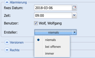 Sie können zu einer Aufgabe einen abweichenden Alarmzeitpunkt definieren und zusätzlich für den Ersteller ebenfalls einen Alarm einstellen. Besonders sinnvoll ist dabei der Alarm bei offenen Aufgaben. In dem Fall bekommt der Ersteller nur einen Alarm, wenn der Empfänger die Aufgabe zum Alarmierungszeitpunkt noch offen (Status grün) hat.