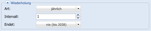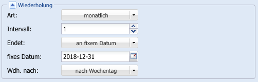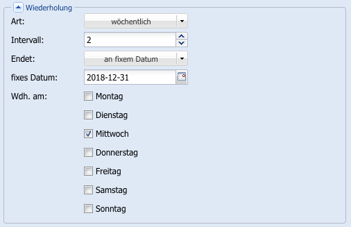 Wiederholungen dienen dazu, wiederkehrende Aufgaben definieren. Haben Sie z. B. jeden Donnerstag um 10:00 Uhr ein Vertriebsmeeting haben, stellen Sie als Wiederholung ein: Art = wöchentlich; Intervall = 1; Endet am: z. B. an dem fixen Datum 31.12.2018; Wiederholung am Donnerstag. Nachdem Sie auf "Aufgabe speichern" geklickt haben, finden Sie nun jeden Donnerstag bis Jahresende eine Aufgabe in Ihrer Aufgabenliste. Wenn Sie den o. g. Vorlauf eingestellt haben, erscheint eine Erinnerung bereits 3 Tage vorher, also am Montag. Beim Verändern von Wiederholungen ändert sich der "Speichern-Button" in eine Auswahl. So können Sie entweder nur diese Aufgabe oder auch alle zukünftigen ändern.
