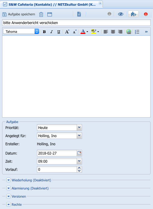 Standardmäßig wird jede Aufgabe erstmal für Sie selbst angelegt, d. h. Ihr Benutzername steht in diesem Feld. Möchten Sie eine Aufgabe für einen Kollegen anlegen, wählen Sie aus dem Drop-Down-Menü einfach den passenden Benutzer aus. Möchten Sie mehr als einem Benutzer eine Aufgabe anlegen oder eine Aufgabe informativ einem weiteren Kollegen hinlegen, können Sie zusätzlich die Funktion delegieren oben in der Funktionsleiste benutzen.