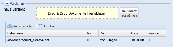Hochladen neuer Versionen: Ziehen Sie eine Datei in das Browser Fenster, erscheint direkt der blaue Bereich für die Dokumentenablage. Ziehen Sie die Datei auf den unteren Bereich Dropzone verstecken. Dann verschwindet der blaue Bereich und Sie können die Datei im Side-Panel des Ursprungsdokuments auf den gelben Drag & Drop Bereich fallen lassen, um eine neue Version hochzuladen. In der Liste der Versionen wird Ihre nun mit Versionsnummer und weiteren Zusatzinformationen hinzugefügt. Mehr zum Thema Dropzone gibt es auch eigene Ersteinführung.
