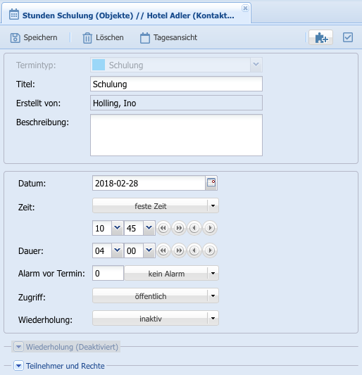 In diesem Kalenderpanel lassen sich alle hinterlegten Daten zu einem Termin ändern. Sehen Sie sich hierzu auch die Dokumentation zum Kalender an.