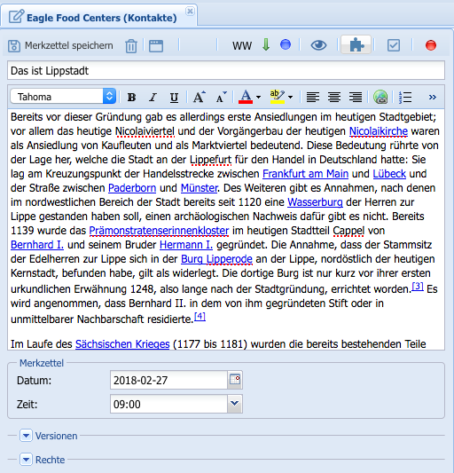 Für den Merkzettel werden analog zu Aufgaben auch Versionen und Rechte zur Bearbeitung unterstützt. So können Sie ganz ohne Textverarbeitung formatierte Dokumente erstellen und gemeinsam bearbeiten.