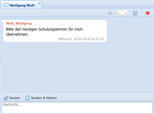 Senden und Merken ist ein besondere Art des Versendens. Mit dieser Funktion verschicken Sie eine Nachricht an einen Benutzer, lassen diese bei sich selber aber auf gelb und merken sich dadurch z. B. dass Sie noch auf eine ausstehende Antwort warten.
