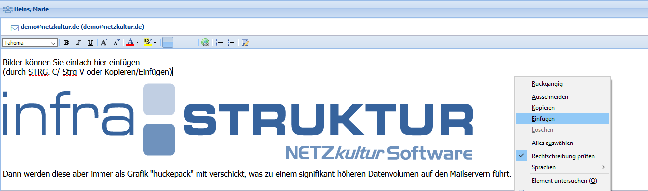 Der Nachteil hierbei ist, dass diese "Bilder" bei jeder verschickten Mail quasi "huckepack" mit versendet werden und das Volumen, also die Größe der Mail, extrem vergrößern. Jede Mail, die Sie verschicken oder beantworten, hätte dann z.B. immer diese 40-50kb Grafik implementiert, die mit jeder Mail auf dem Server liegen würde.