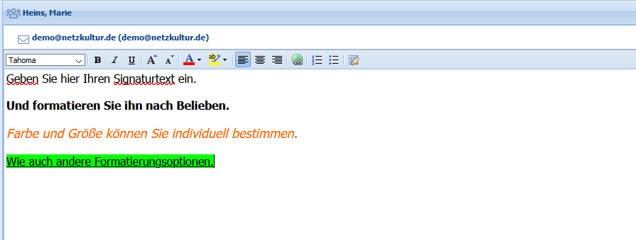 Haben aber mehrere Benutzer Zugriff auf ein Mailfach, zum Beispiel die info@ - Adresse, kann und muss natürlich im Umkehrschluss auch jeder Benutzer eine eigene Signatur für sich erstellen und eingeben.