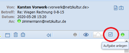 Das Anlegen einer Aufgabe mit der rechten Maustaste macht es noch schneller. Sie werden tagesgenau an Ihre Aktivität erinnert und haben diese somit später wieder auf der Startseite: In der angelegten Aufgabe ist die "Ursprungsaktivität verknüpft, die, in diesem Fall eine E-Mail, dann nämlich über ein Icon direkt in der Aufgabe zu öffnen ist.