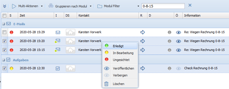 Nutzen Sie dafür zum Beispiel oben die Filterfunktion und suchen Sie nach "Holling". Es werden Ihnen alle Aktivitäten und Informationen zu und von "Holling" angezeigt. Räumen Sie diese auf. Genauso können Sie zum Beispiel nach einer Vorgangsnummer (wie hier im Beispiel 0-8-15) oder nach einem Thema suchen, um "doppelte Informationen" zu grünen.